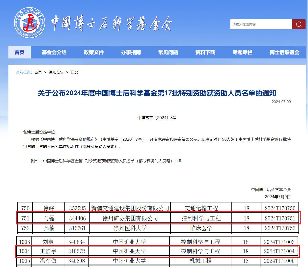 入选2024年度中国博士后科学基金第17批特别资助教师名单