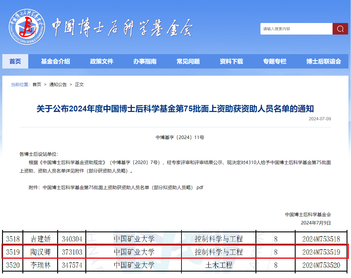 入选2024年度中国博士后科学基金第75批面上资助教师名单