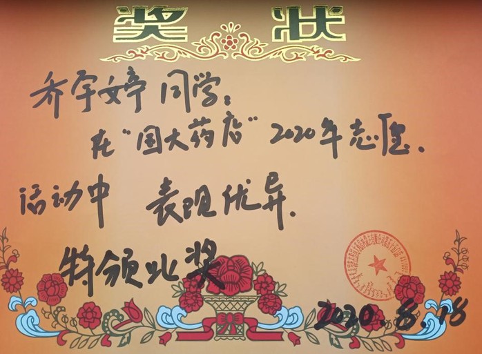 为了解社区医疗,服务周边百姓,队员乔宇婷于八月五日至八月十八日在内蒙古自治区呼和浩特市社区药房开展了志愿活动。内容包括帮助店员整理分类各种药物,为年龄大的病人提供“送药到家”的服务以及打扫店内卫生确保干净的环境。在本次实践过程中,乔宇婷了解了社区医疗工作主要内容,给工作人员减轻了负担,为药房和周围老百姓做出了贡献。