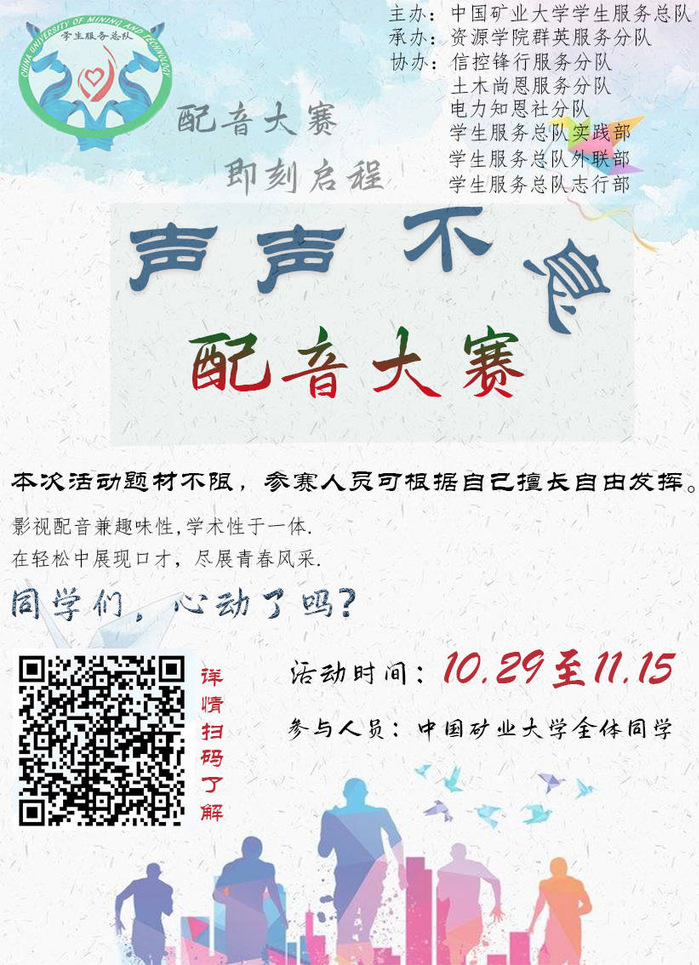 本次大赛采用线上报名的形式,通过张贴海报、公众号宣传等方式吸引了大批矿大学子参与比赛。参赛作品不限题材不限形式,但不得使用声音处理软件处理作品。参赛选手可自行组成人数为1~4人的队伍,挑选组长填表报名,合作完成参赛作品。比赛报名的截止日期为11月3日。