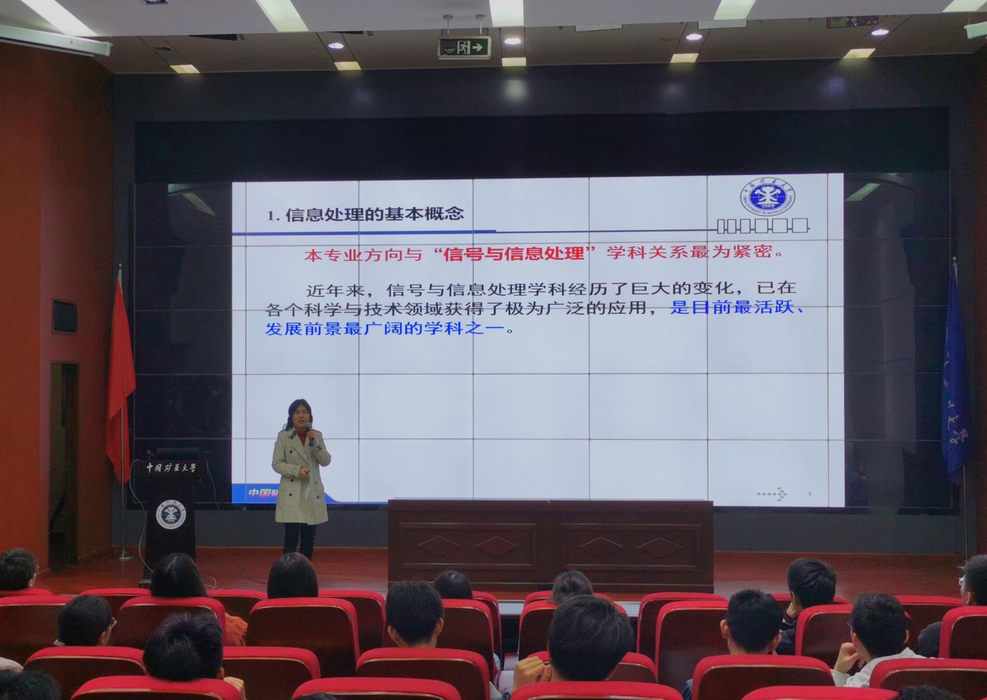 徐永刚副教授首先向同学们介绍了本次专业分流的具体内容和实施办法,让同学们明确专业分流的操作流程,引导同学们根据自身兴趣谨慎选择。随后,全国煤炭教学名师、信息处理研究方向负责人王艳芬教授,通信技术研究方向负责人郭星歌副教授,物联网研究方向负责人徐永刚副教授,光电子与微电子技术研究方向负责人刘海教授以及电子工程研究方向李松副教授依次发言,他们从学科特点、研究内容、典型应用、知识框架、就业方向、教师队伍等方面,对电子信息工程专业的五个研究方向进行了详细介绍。王艳芬教授指出,信号处理研究已在各个科技领域获得了极为广泛的应用,是信息科学领域发展极为迅速的研究方向之一,建议对信号处理及技术感兴趣的同学选择信息处理方向进行学习。郭星歌副教授生动讲述了通信工程的各类应用,使同学们准确认识了该学科的特点。徐永刚副教授介绍了物联网方向与生活的密切联系,同学们兴趣高涨。刘海教授通过讲述我国芯片研发现状,强调光电子与微电子技术的重要性,号召同学们为中华之崛起而读书,积极投身光电子与微电子方向学习与研究。李松副教授针对电子工程方向,介绍了方向特点,并讲述了电子行业人才稀缺的现状。