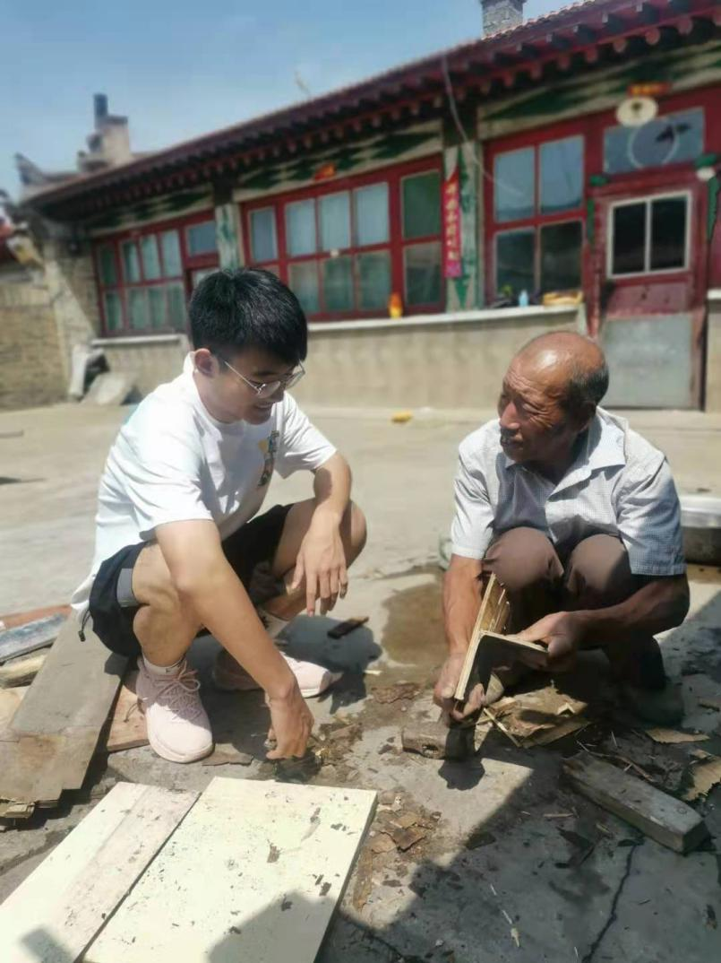 8 月17日,实践团成员王启飞跟随大同市留守儿童协会的志愿者们驱车前往广灵县梁庄乡西堡村和望狐村慰问孤寡老人和留守儿童。实践团成员在西堡村爱心食堂门口为老年人免费理发,并先后走访了5户留守儿童和孤寡老人家庭,深入调查了解他们的生活状态。