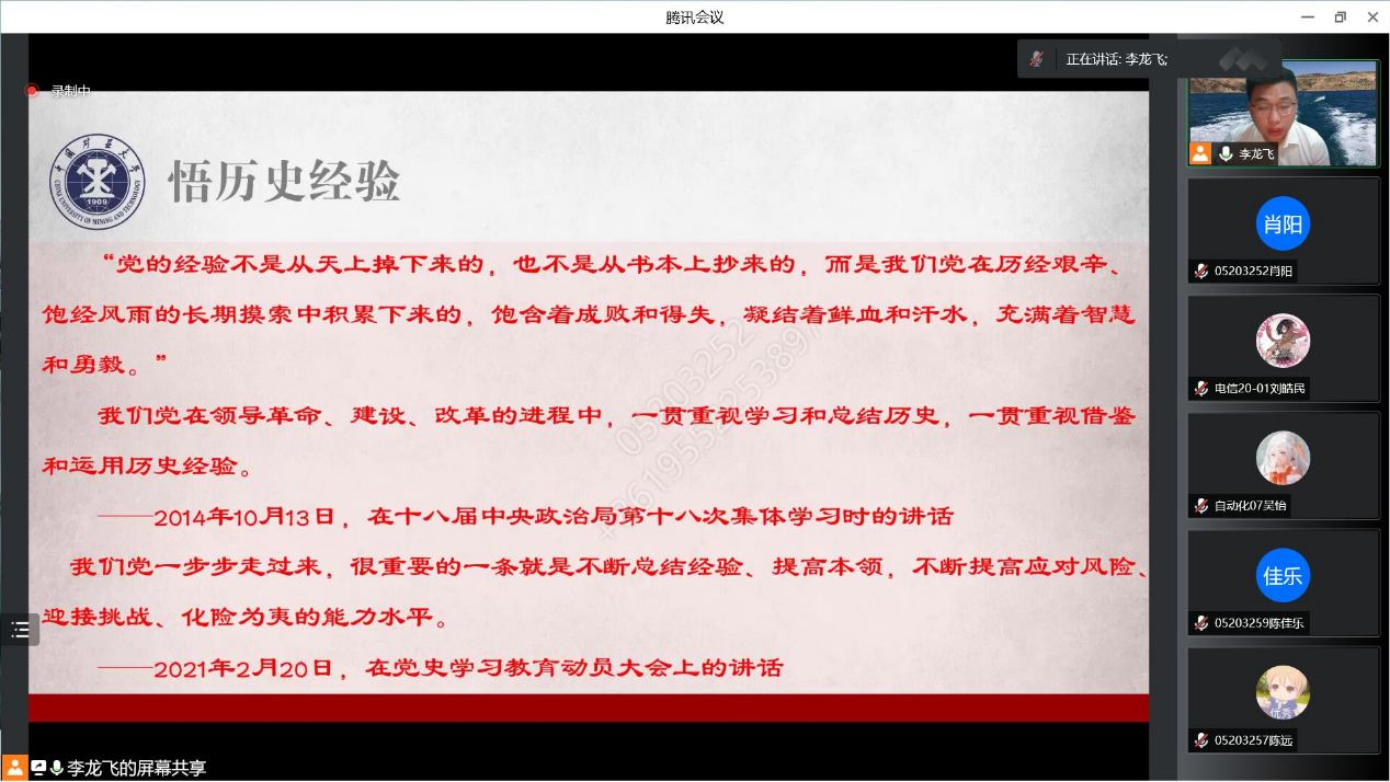 于5月15日晚举办“青年支书论坛”,邀请马克思主义学院学生党支部书记、外文学院优才专项辅导员李龙飞主讲,开展“学思践悟守初心:学生干部需要这么做”主题交流分享,党员工作站全体成员、各年级学生党员、发展对象和入党积极分子共同参与了本次会议,会议通过腾讯会议在线上开展。