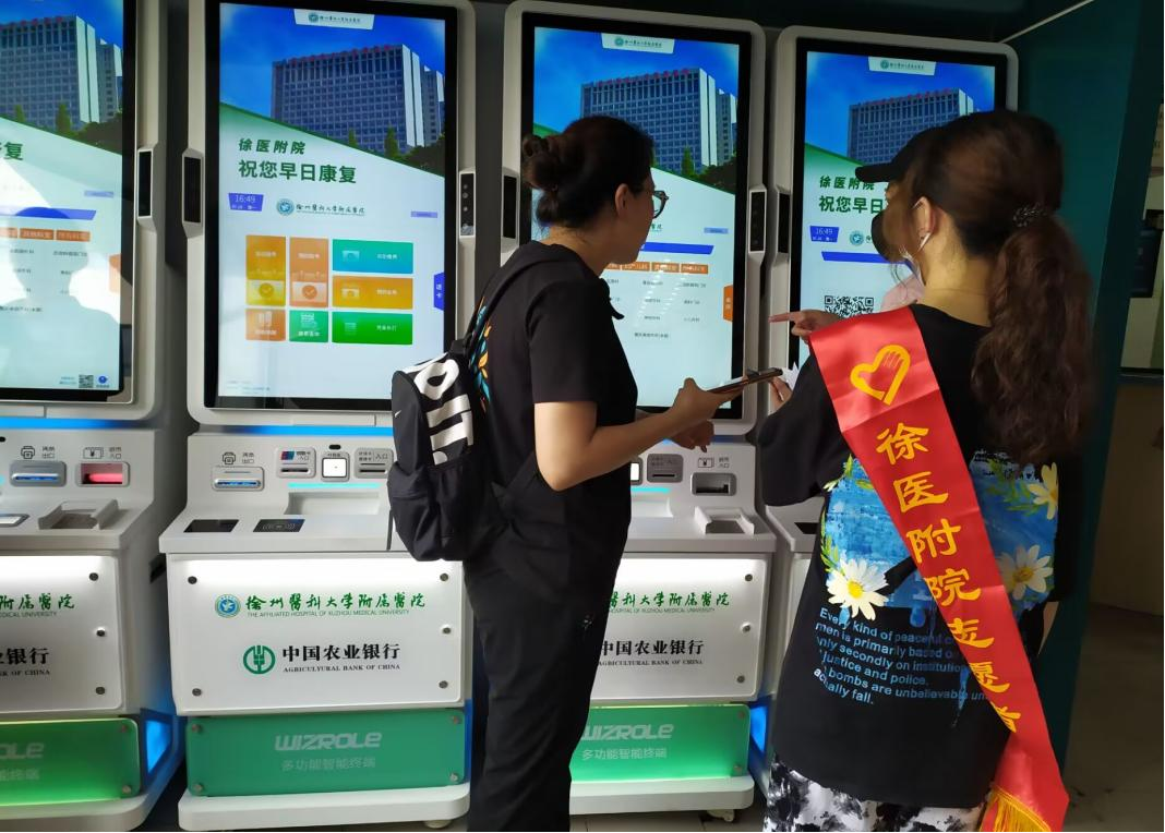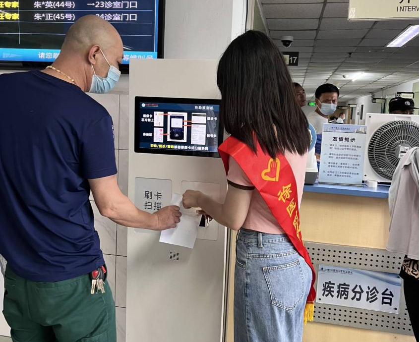 7月10号下午,实践团队前往徐医附院门诊部开展导医志愿服务。首先,团队成员被分配到不同的诊区,在护士们的悉心讲解与指导下,熟悉了徐医附院的就医流程。随后,团队成员开始引导患者顺利报到排号,耐心地向患者解释就医所需的步骤和流程,以及报到失败的原因,并提供必要的协助。同时,团队成员们还提供个性化的帮助,确保患者掌握自助机器的使用技巧,以便成功挂号缴费。