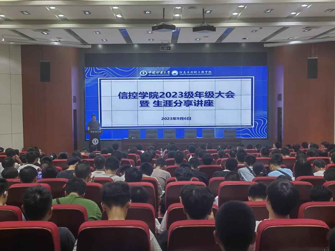 于学院楼A101报告厅召开2023级年级大会暨生涯分享讲座,对2023级新生进行全面的入学教育。会议由辅导员李鸣轩主持,辅导员牟晓博以及2023级全体本科生参加会议。