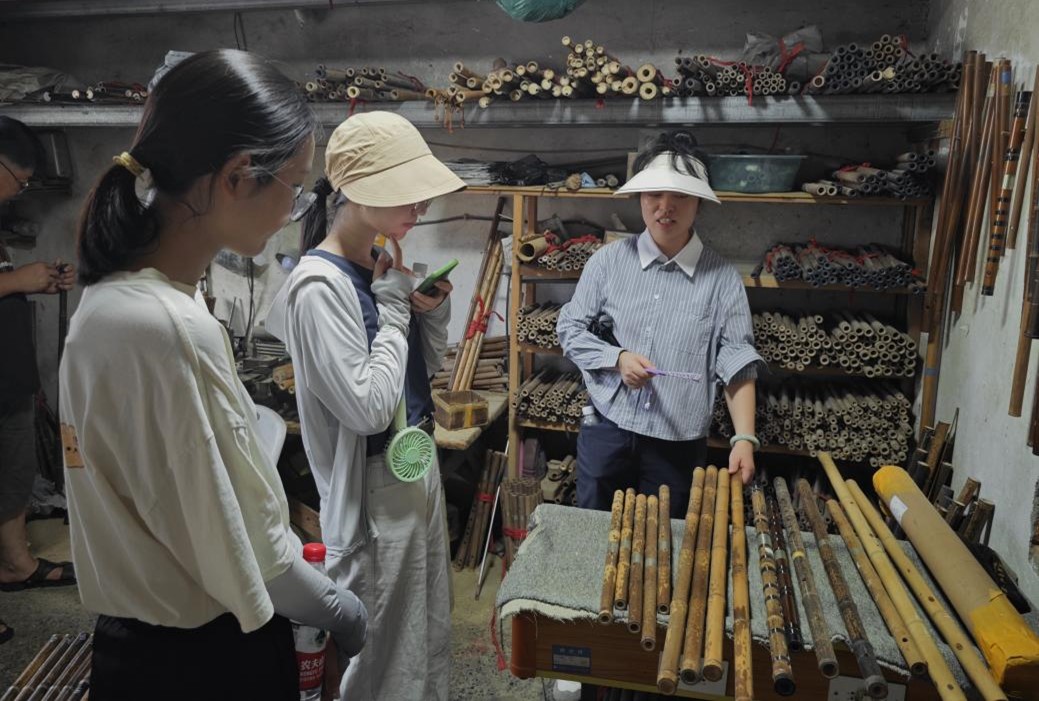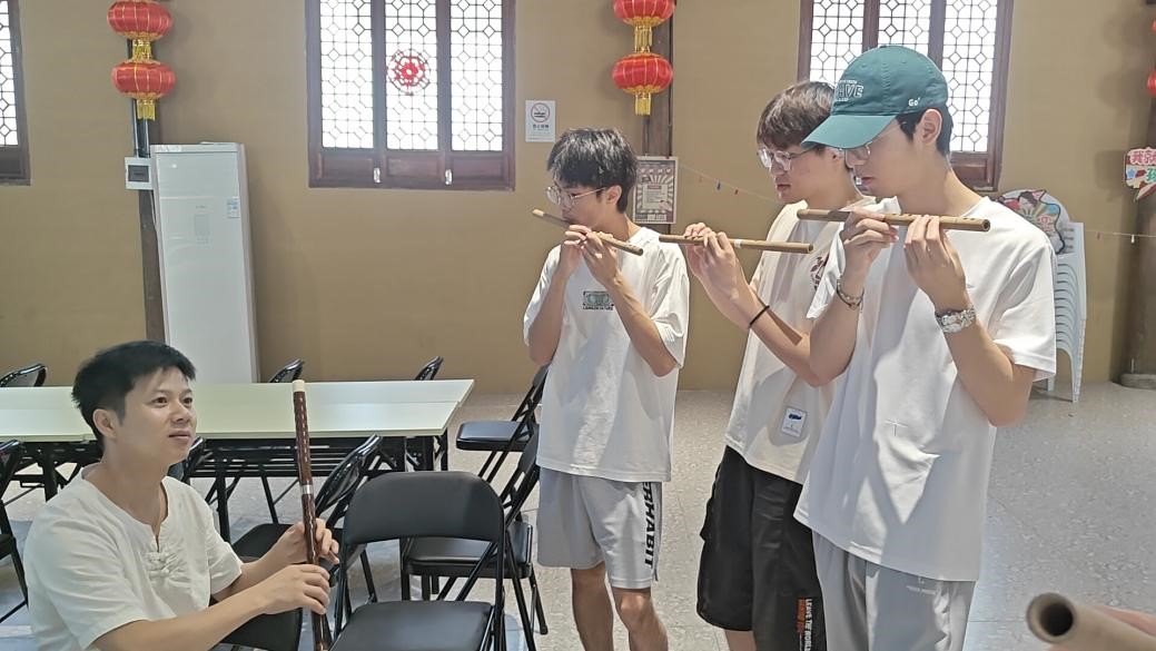 团队成员学习吹奏竹笛