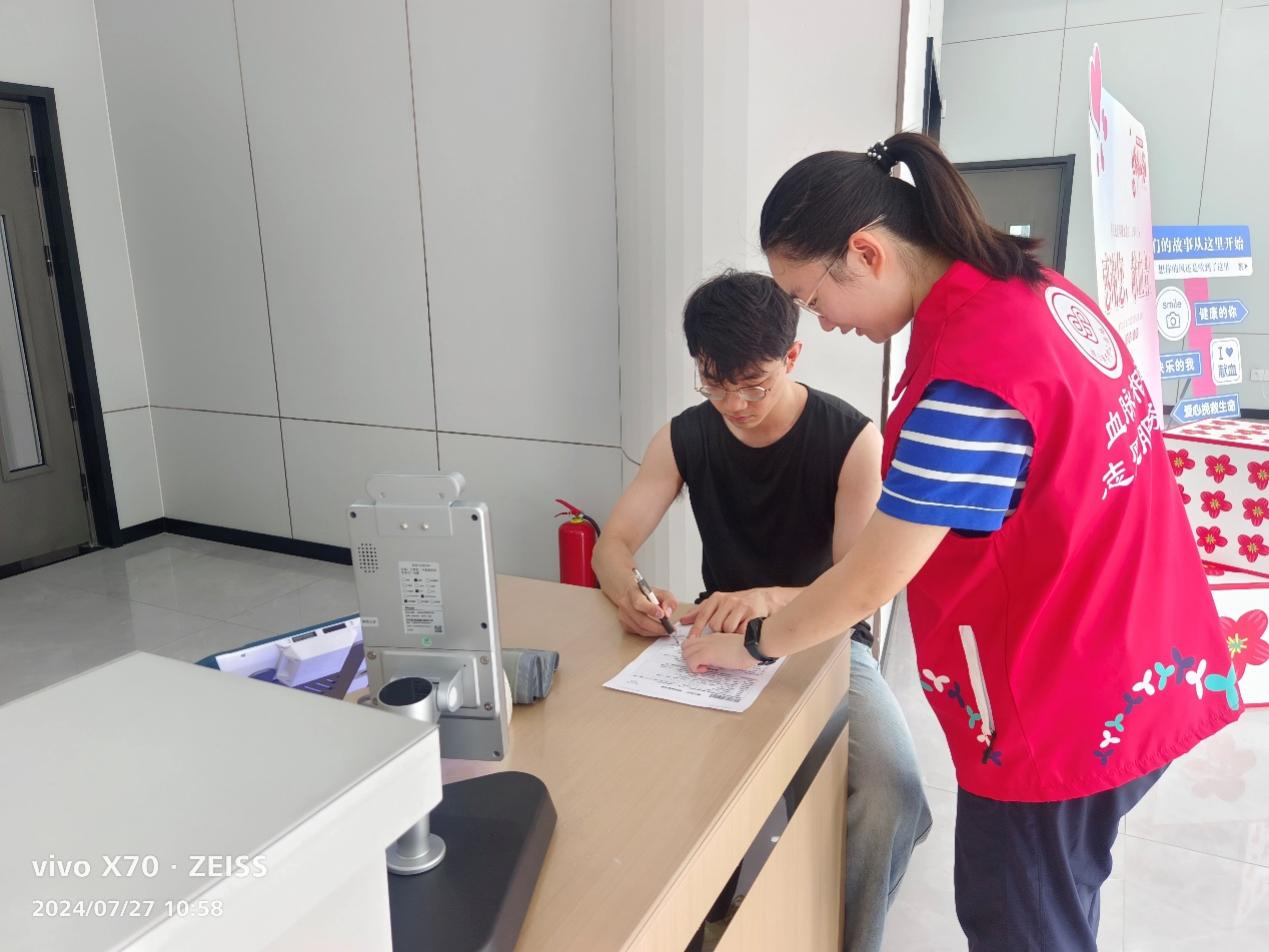 7月25日,团队成员前往大润发献血屋进行培训和服务。在志愿者培训期间,张馨文同学学习了献血的相关知识,了解了献血的条件、流程、注意事项等。随后,她为前来的献血者提供献血前后一系列服务,指导献血者填写登记表,维护现场秩序,并帮助医护人员包扎绷带,确保献血活动的顺利进行。