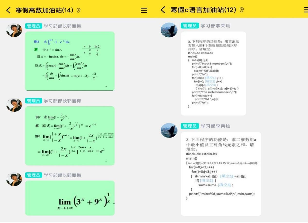 本次答疑通过创建C语言、C++、高等数学、大学英语这四个学科的专属答疑群的方式,将有需要的同学集中起来,并邀请对应学科的高分同学在群内进行答疑、提供帮助。在各学科答疑群中,答疑者每天都会发布针对性的题目,以帮助同学们巩固知识。当同学们提出问题时,他们会迅速响应,详细讲述解题思路和相关知识点并给出正确答案。同时,年委会成员还对补考的各项事宜,如考试时间、考试形式等,进行了逐一通知,确保同学们做好充分准备。