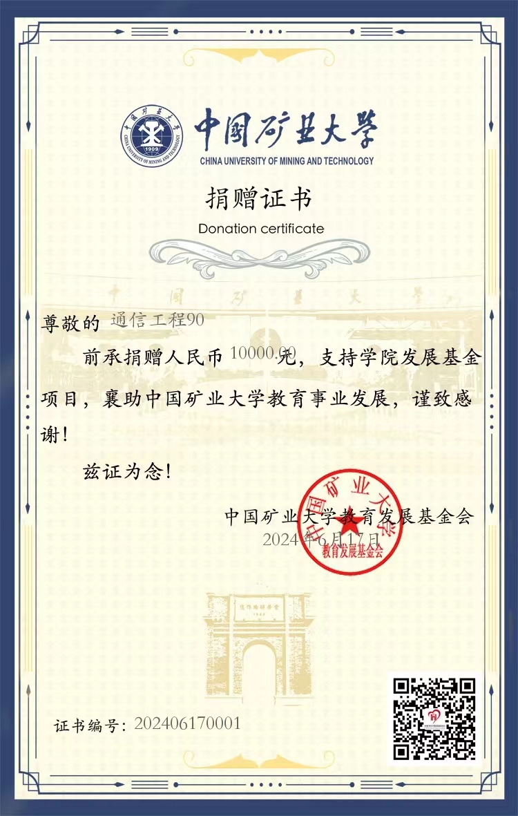 2024年6月17日,通信90级校友为学院咖啡吧建设捐赠1万元。