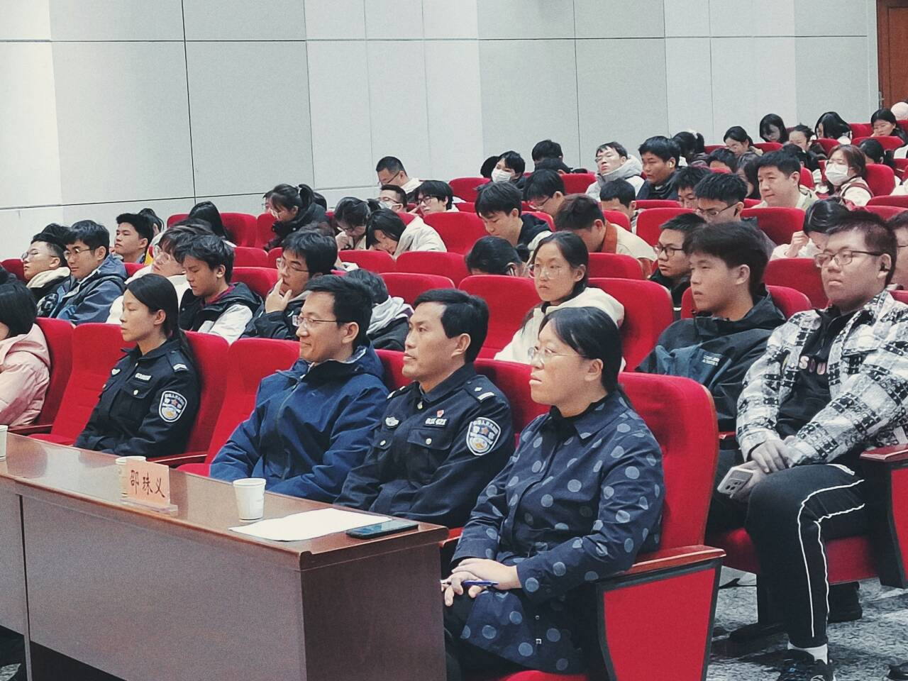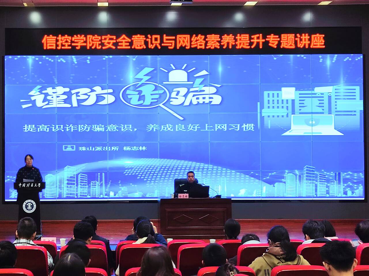 在学院楼A101报告厅组织开展“安全意识与网络素养提升”专题讲座。校警务工作服务站驻校民警杨志林以《提高识诈防骗意识 养成良好上网习惯》为主题作讲座,徐州市公安局景区分局珠山派出所副所长邵珠义出席讲座,校党委保卫部保卫科科长石莹、珠山派出所民警殷晓彤、学院辅导员老师、学生代表共计300余人参加讲座。讲座由学院党委副书记翟文艳主持。