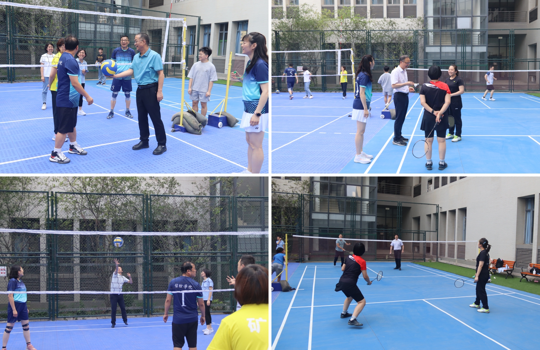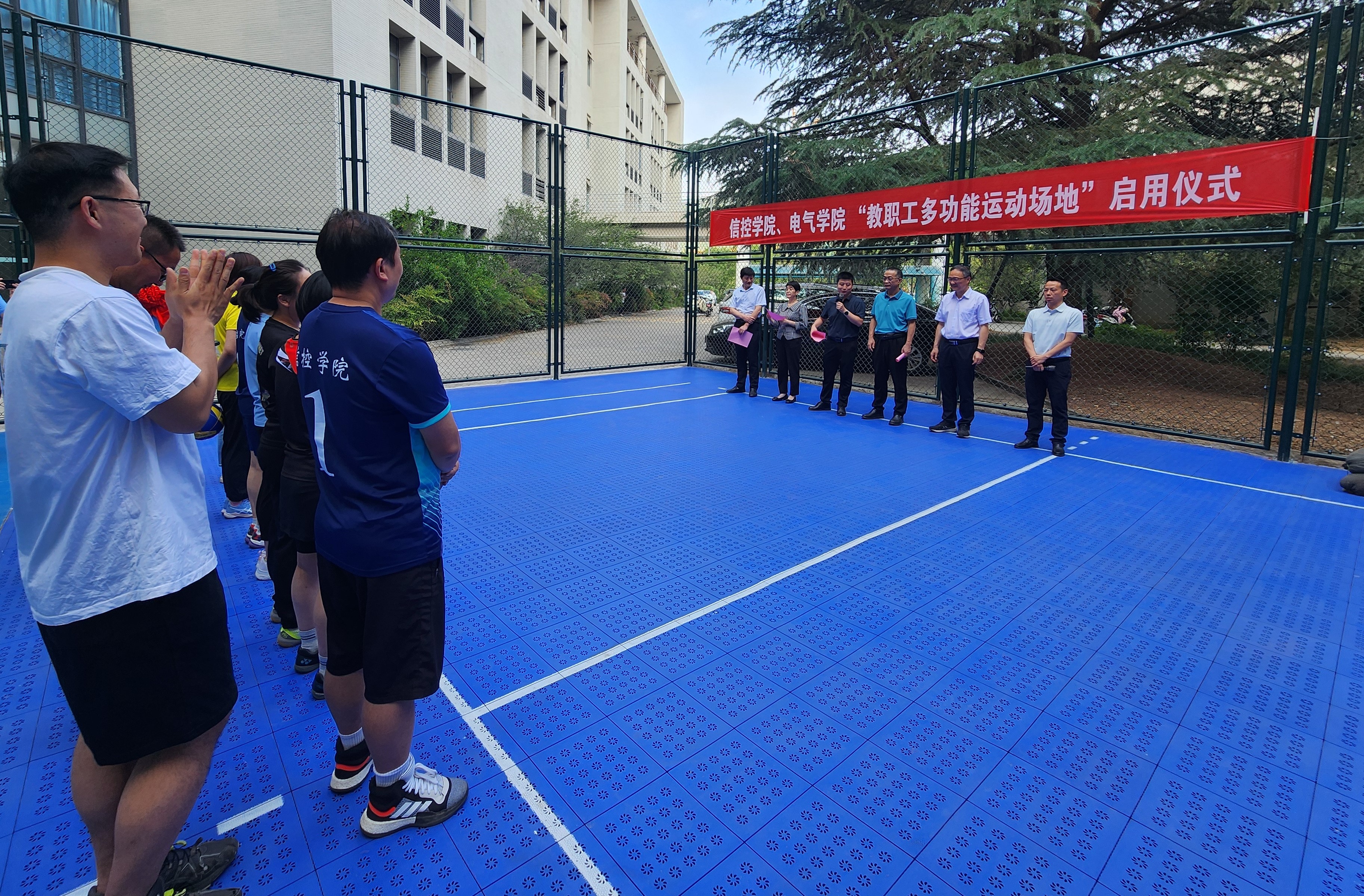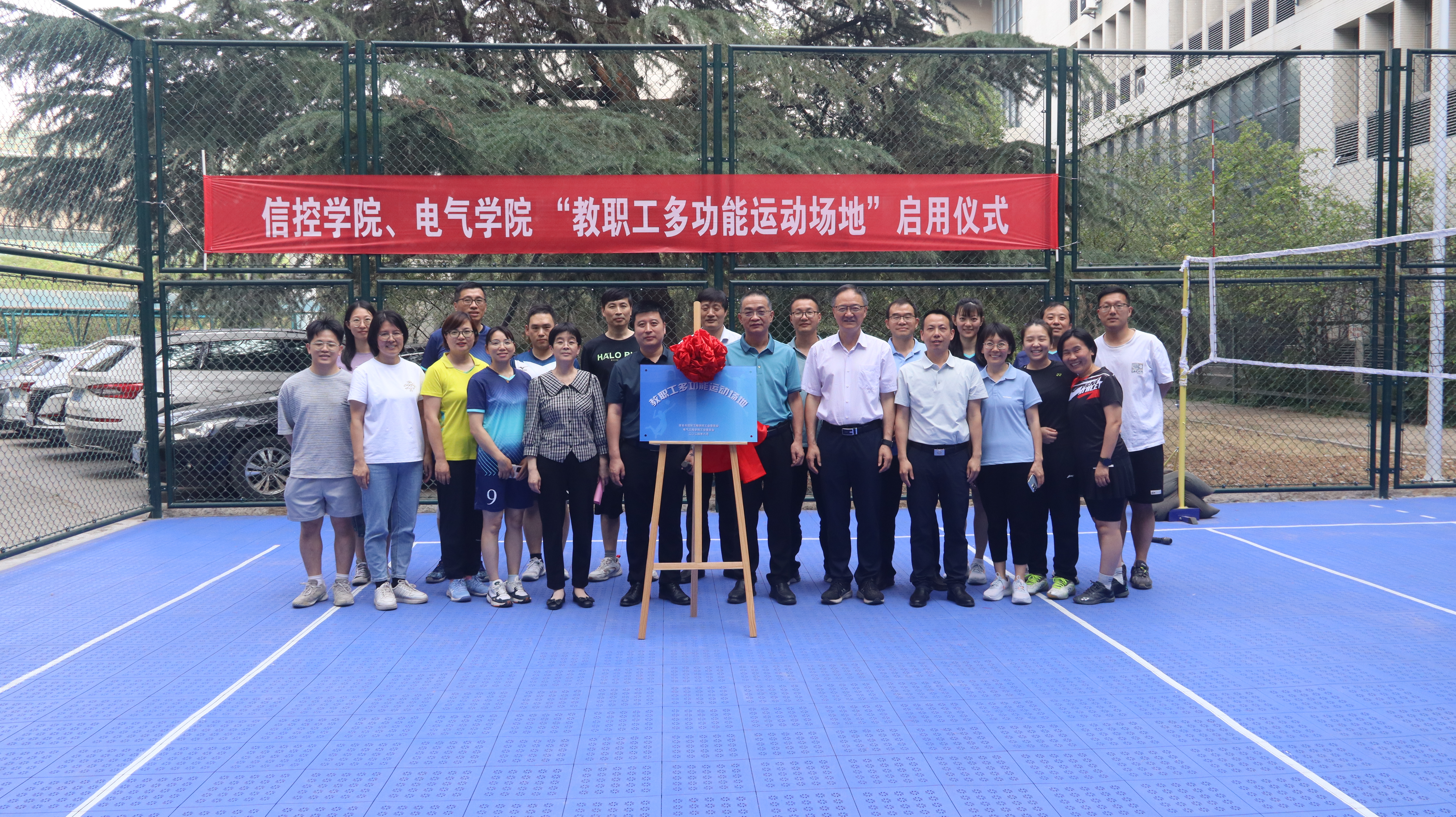、电气学院“教职工多功能运动场地”启用揭牌。陈仲元和伍小杰分别为气排球和羽毛球邀请赛开球。此外,校气排球协会还捐赠了气排球。
