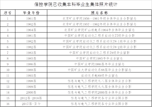 历届本科毕业生集体合影照片,按学院(专业、年级)征集,已有照片的专业年级无需提供,名单如下(按照毕业年级统计)。