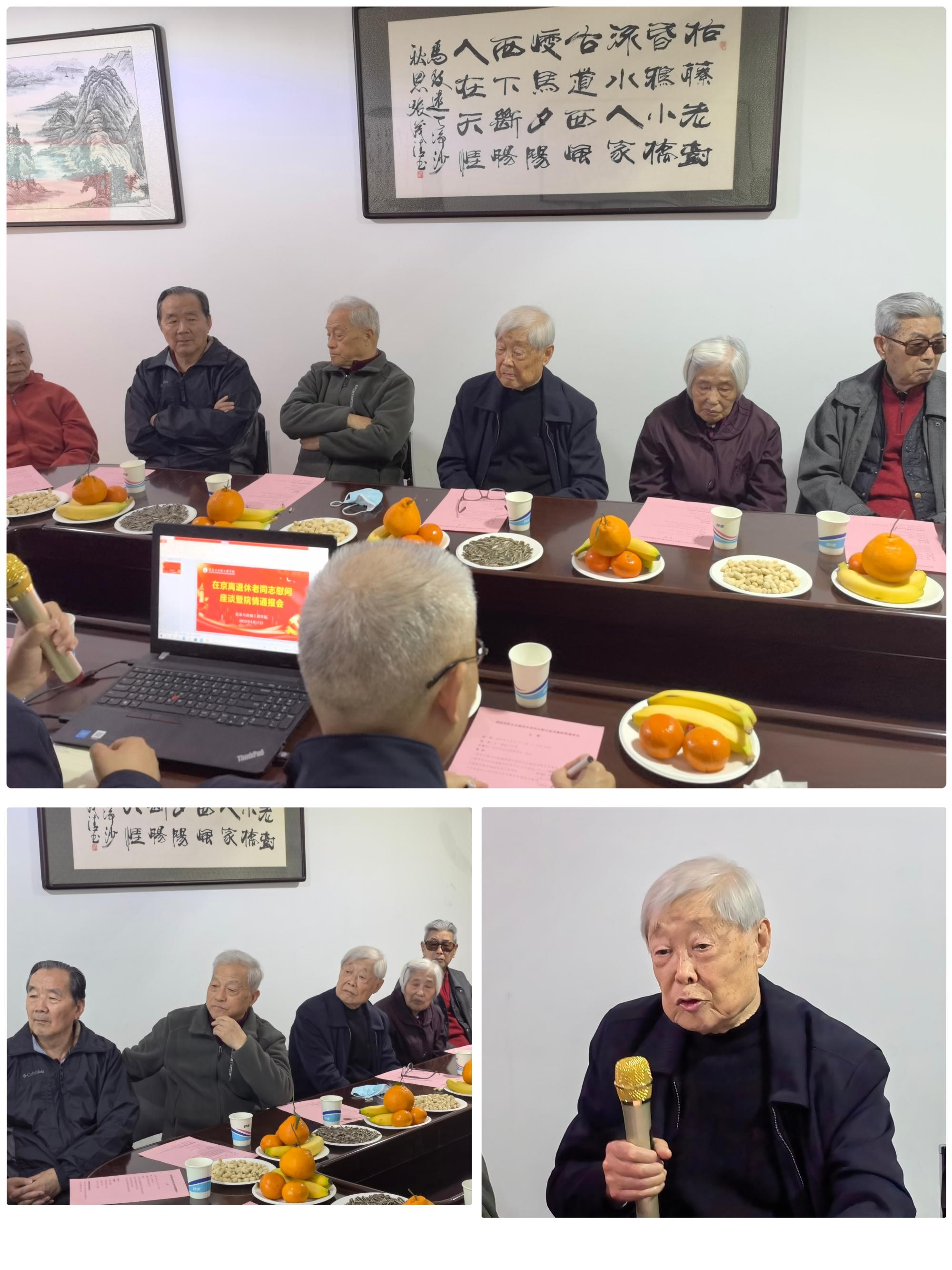 4月17日下午,院党委书记程德强、副院长李世银、陈平,党政办主任余智超一行四人,在京西一楼教工之家举行了慰问座谈会,在京的11名老同志参加会议。4月19日上午,学院在文昌校区教工之家举行慰问座谈会,在家的院领导,23名离退休老同志,学院党政办、工会、妇委会相关负责人及部分关工委委员参加会议。会议由副院长陈平主持。