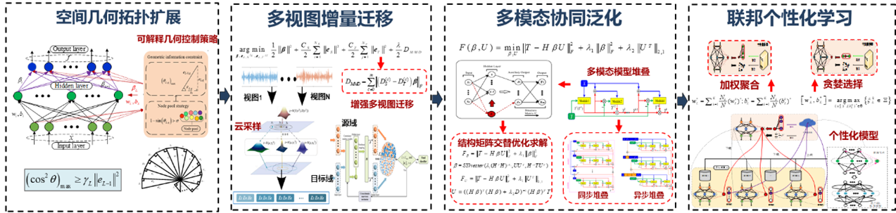 工业系统资源受限特性限制了高消耗深度学习模型的工业应用,为此,团队致力于工业系统轻量化可解释学习模型研究。通过深度融合构造式神经网络、空间几何理论、非迭代随机学习等理论方法,揭示数据驱动构造式网络学习模型的黑箱内在运行机理,为工业系统数据分析与建模提供低代码实现技术。并针对工业系统多时间尺度特性、多源数据耦合、高质量样本稀缺、复杂多源噪声干扰等综合工业特性,分别与特权信息、多视图学习、联邦学习、类不平衡学习、鲁棒学习等算法相结合,提出了一系列的工业系统数据分析与建模新方法。研究成果应用于矿物分选过程难测关键参数软测量以及关键生产设备健康状态诊断等,为工业过程智能优化控制与诊断提供精准可靠的模型基础。