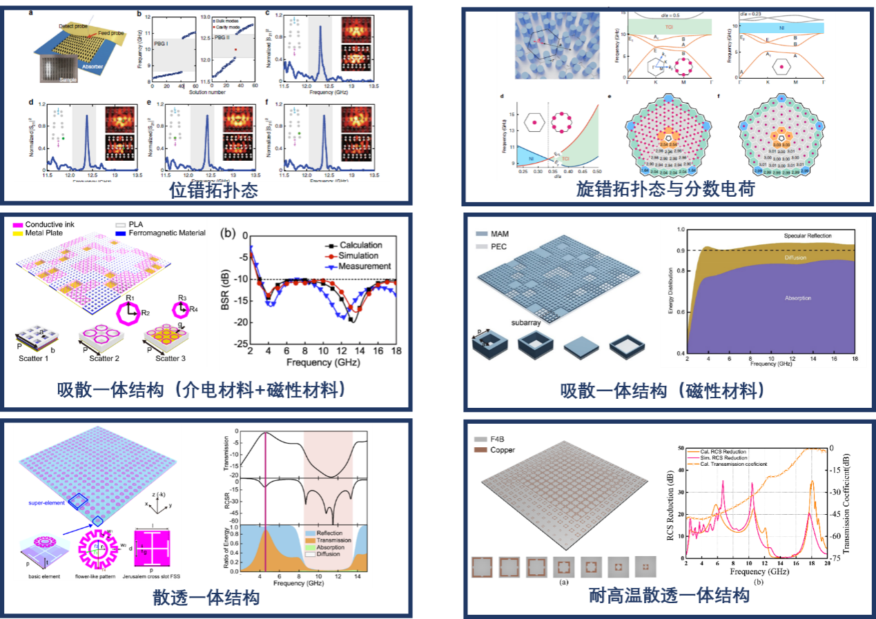 人工电磁材料因其新颖的电磁特性和丰富的设计自由度,成为构建新一代电磁器件的有效载体。聚焦人工电磁材料的高频物性特征,研究设计电磁信息生成与处理器件,突破传统电磁器件带宽小、损耗大、体积大等难题。研发基于超材料/超表面的高性能隐身结构、隐身/透波一体结构以及隐身天线等多功能电磁器件,提高武器装备的生存突防能力;研发结构可调和参数优化的智能反射面样件,推动智能反射面在特殊工业场景下的工程应用;开展拓扑超表面基础理论研究,设计结构紧凑、可与传统传输线互连、动态可控的电磁拓扑器件,解决材料损耗、结构缺陷、加工精度、以及使用磨损等“缺陷”造成的传输效率降低、工作频率偏移等问题。