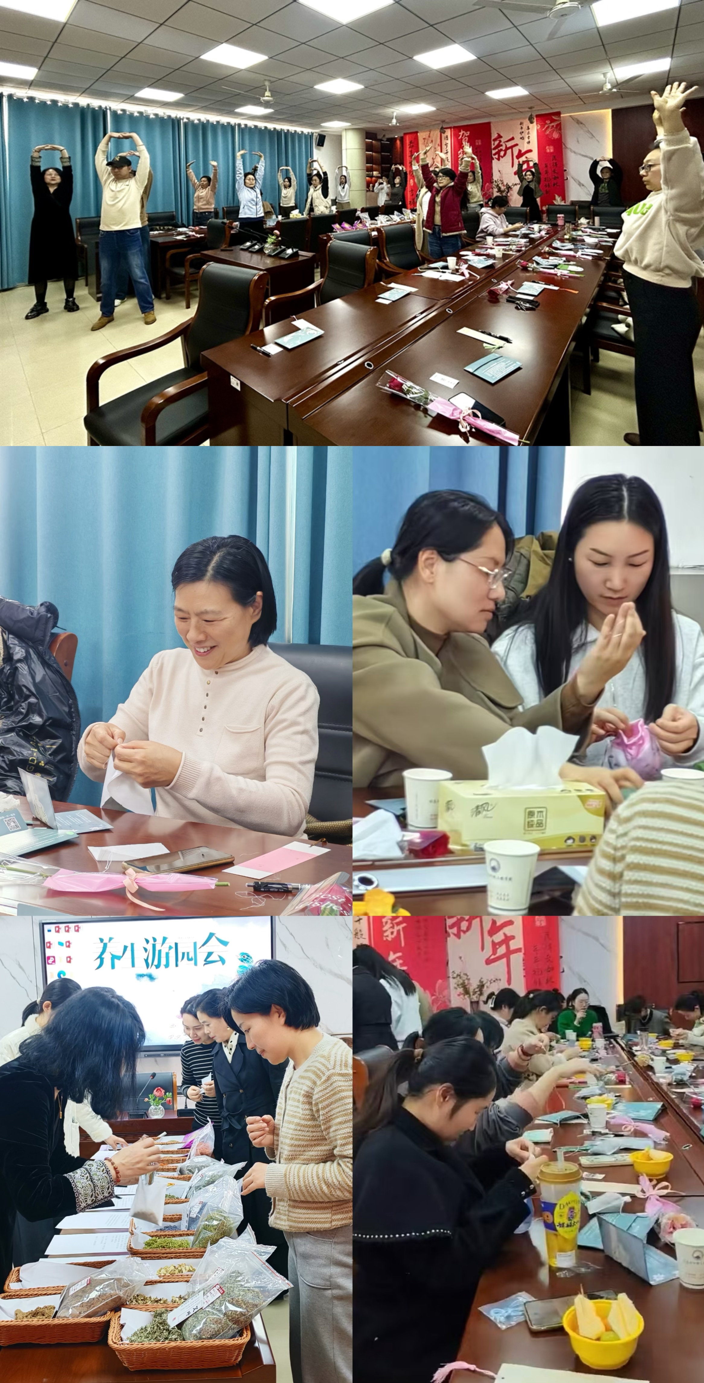 活动现场欢声笑语不断,其乐融融。在专业中医团队的带领下,女教职工代表现场练习了八段锦,舒展筋骨、调和气血;中医专家结合教师职业特点,系统讲解养生保健知识,示范风池、肩井等要穴按摩手法,并逐一提供个性化体质调理建议;女教职工还体验中药香囊缝制,根据专业配方将艾叶、丁香、藿香等道地药材科学配比,打造兼具安神助眠、疏肝解郁功效的专属香囊。