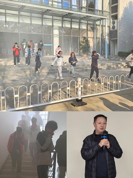 演练模拟火灾真实场景进行。随着学院楼A区三、四楼层释放模拟烟雾及警报响起,实验中心各岗位人员迅速响应,做好师生疏散引导;师生们用湿毛巾捂住口、鼻,按照应急疏散指示标识和既定的应急疏散路线,有序地疏散到楼外安全区域。